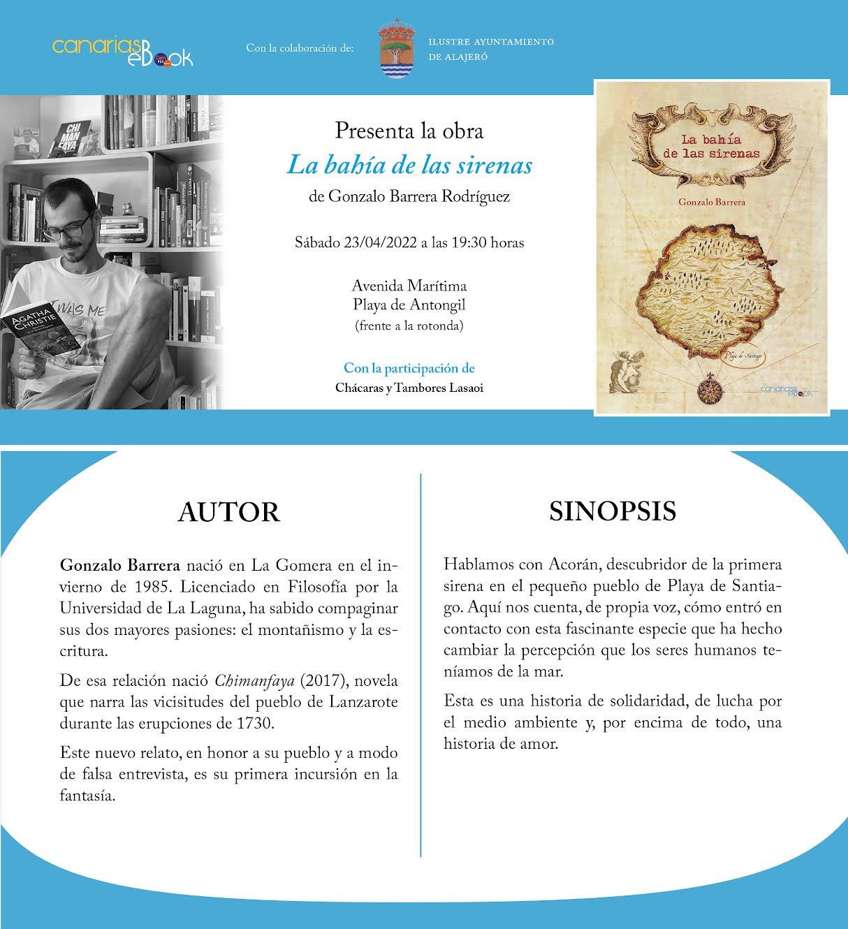 La avenida marítima de Playa de Santiago, localidad natal de Gonzalo Barrera Rodríguez es el escenario elegido para la presentación de su último libro ‘La Bahía de las Sirenas’ a las 19:30 horas. El acto estará acompañado por el grupo de Chácaras y Tambores ‘Lasaoi’.