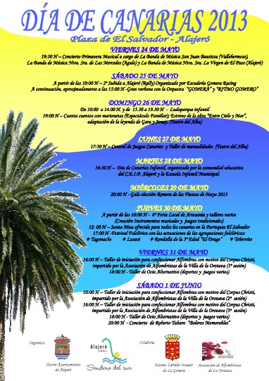 El Ayuntamiento de Alajeró con la participación de colectivos vecinales pondrá a partir del próximo jueves, 24 de mayo y hasta el sábado, 1 de junio un amplio programa de actos con motivo del Día de Canarias, que se celebra en esta Comunidad el jueves, 30 de Mayo.