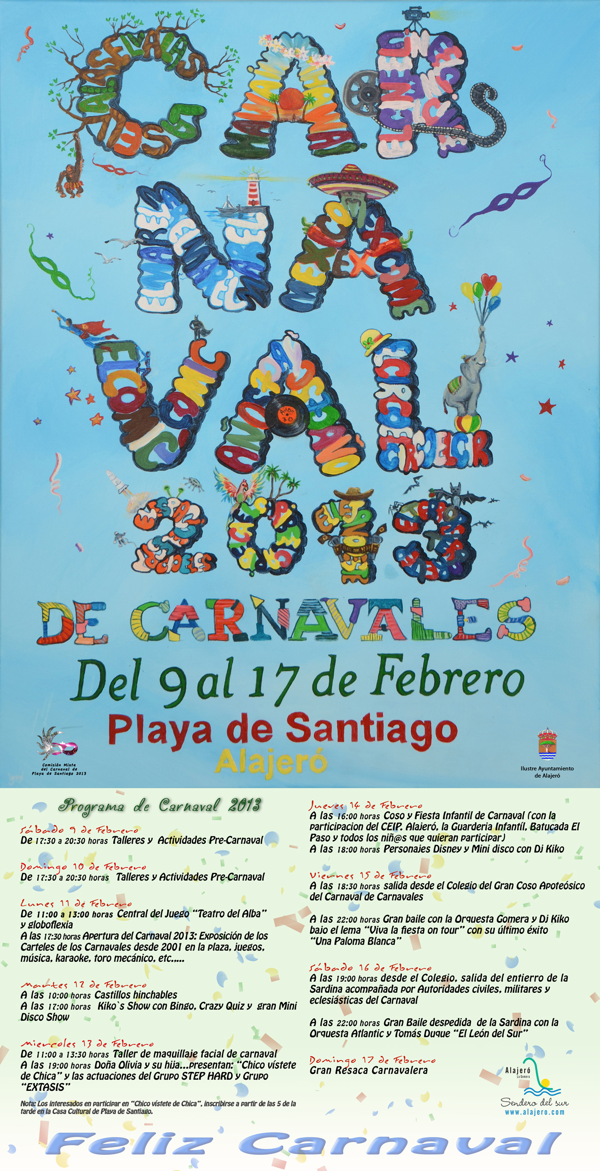 El Ayuntamiento y la Comisión Mixta del Carnaval 2013, animan a los vecinos y vecinas a participar en todos los actos programados, así como invitan a todos los visitantes a disfrutar de unas fiestas que conservan el sabor de antaño y la diversión de ser uno de los carnavales más importantes de La Gomera.