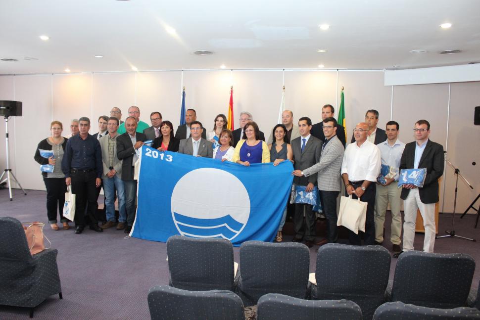 La presidenta del Cabildo de La Palma, Guadalupe González Taño, el alcalde de Breña Baja, Borja Pérez Sicilia la directora del Servicio Canario de la Salud, Juana María Reyes Melián, y el vicepresidente de ADEAC, José Palacios Aguilar, han hecho entrega de las banderas a los representantes de los municipos y a los gestores de puertos deportivos galardonados en la campaña Bandera Azul 2013.