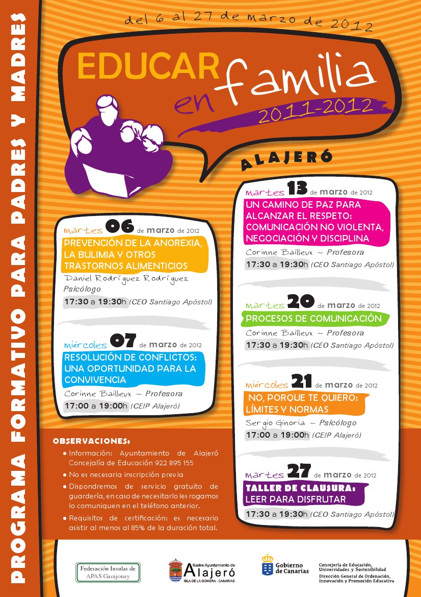 El miércoles, 21 de marzo a las 17:00 horas y en el C.E.I.P de Alajeró llega el turno al psicólogo, Sergio Ginoria que impartirá la conferencia, “No, porque te quiero: límites y normas” y por último se celebrará un taller de clausura el martes, 27 de marzo bajo el título “Leer para disfrutar” a las 17:30 en el C.E.O Santiago Apóstol.