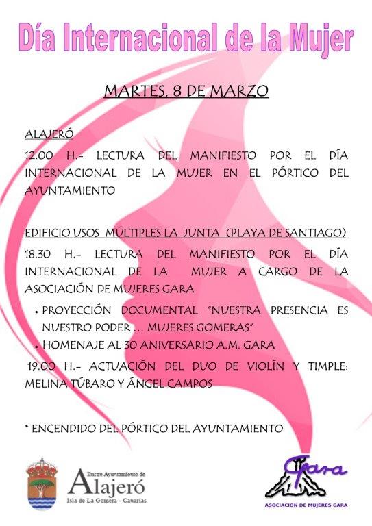 El Ayuntamiento de Alajeró en colaboración con la Asociación de Mujeres Gara, organiza para el próximo martes, 8 de marzo con motivo del Día Internacional de la Mujer una serie de eventos conmemorativos con tan importante fecha.